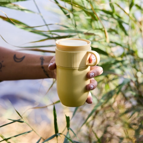 Sagaform Ted termokrus i frisk gul farge er en stilig favoritt med smart funksjonalitet. Det dobbeltveggede, vakuumisolerende designet holder drikker varme i 4 timer og kalde i 8 timer, mens 360-graders åpningen gir en naturlig drikkeopplevelse.